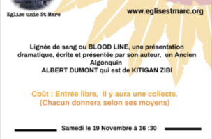 Lignée de sang ou BLOOD LINE, une présentation dramatique, écrite et présentée par son auteur, un Ancien Algonquin ALBERT DUMONT de KITIGAN ZIBI Coût : Entrée libre, il y aura une
